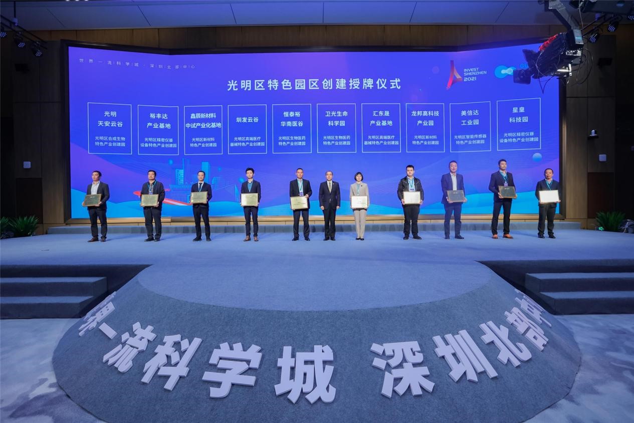 特色园区是产业空间的一种具体载体形式。近年来,光明区聚焦先进制造业发展需求,大力推进特色园区建设,积极应对疫情带来的各种困难压力和挑战,加快转型升级步伐,推动产业链、创新链、价值链深度重构,培育壮大一批标志性、引领性的先进产业集群,不仅提高了经济发展密度,同时也提升了园区创新发展能力。招商大会上,光明区向卫光生命科学园、恒泰裕华南医谷、光明天安云谷(一期)等10家特色产业创建园授牌。首批打造的十大特色产业创建园,总占地面积38.9万平方米,总建筑面积161.2万平方米,可供应厂房98万平方米。
